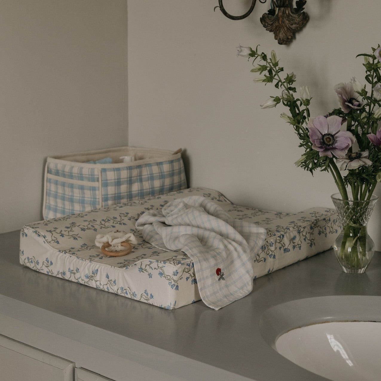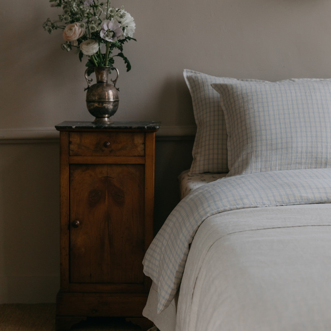 Our new and refined organic cotton muslin bedding in Gingham Sku Blue – finished with delicate embroidery and picot edge details.
