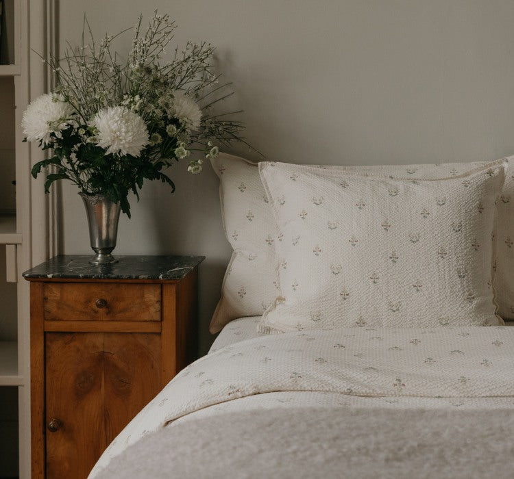 Designed to be loved and lived in, your seersucker bedding is easy to care for and softens beautifully over time. Wash at 40°C with similar colours, preferably inside out to preserve the fabric and print. Its naturally crinkled texture is meant to remain – no ironing needed. Tumble dry on medium heat or hang to dry, and avoid bleach to keep it soft and long-lasting.