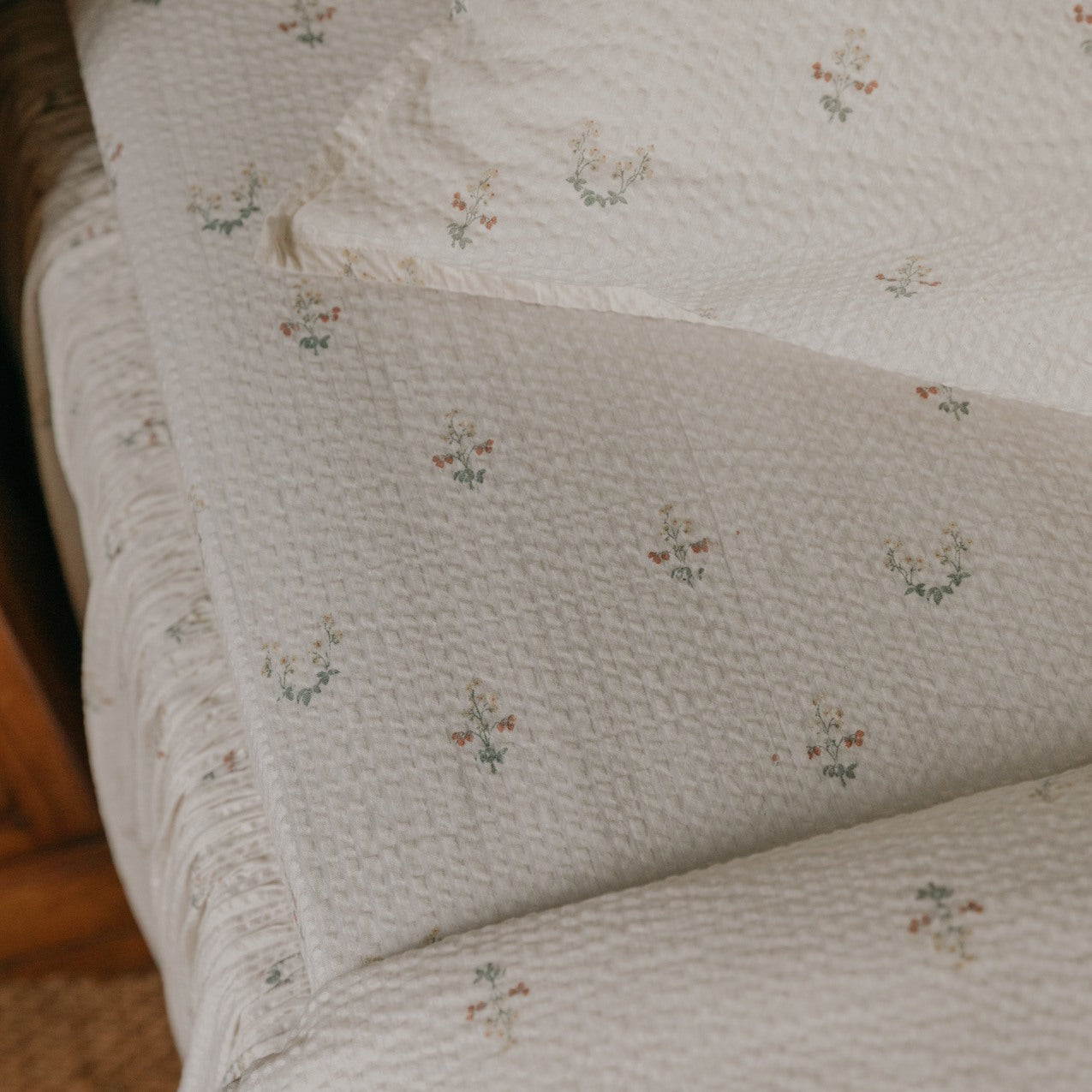 A fresh and airy ornamental print with strawberries and delicate florals, set against our textured Seersucker fabric – perfect for spring and summer bedding